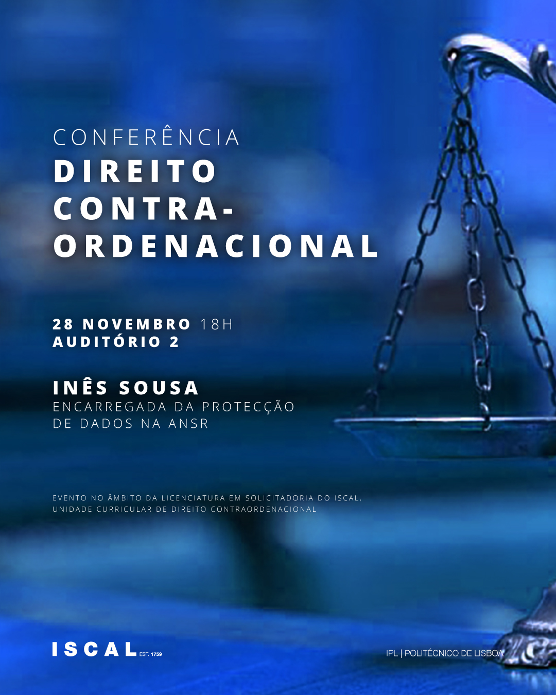 No dia 28 de novembro, no Auditório 2 pelas 18h, o ISCAL tem o prazer de receber Inês Sousa, encarregada da Protecção de Dados na ANSR - Autoridade Nacional de Segurança Rodoviária, para uma conferência sobre o procedimento Contraordenacional na prática do solicitador: análise aplicada as contraordenações rodoviárias.